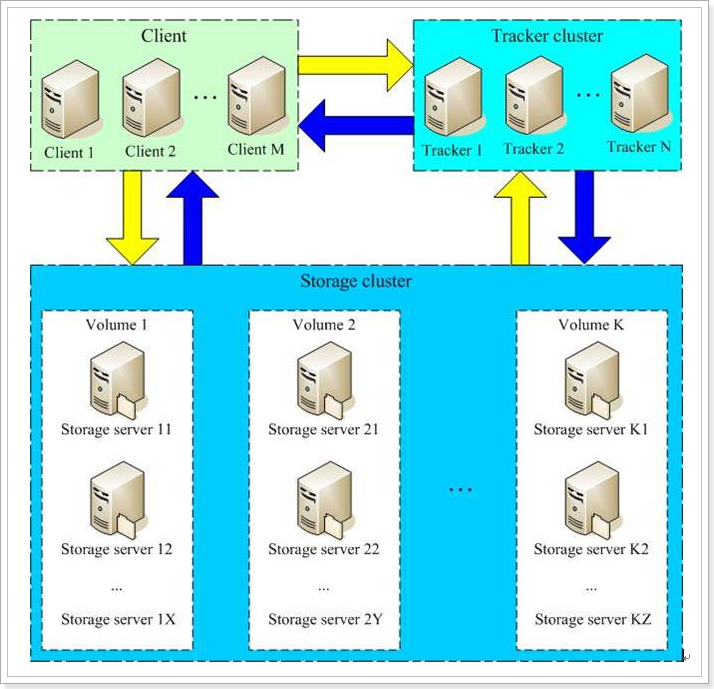 - Tracker Server:跟踪服务器,主要负责调度storage节点与client通信,在访问上起负载均衡的作用,和记录storage节点的运行状态,是连接client和storage节点的枢纽。